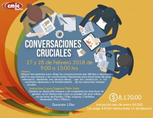 CONVERSACIONES CRUCIALES 8 enero, 2018 by Jocelyn Carbajal Jocelyn Carbajal No comments yet Navegación de entradas CONVERSACIONES CRUCIALES
